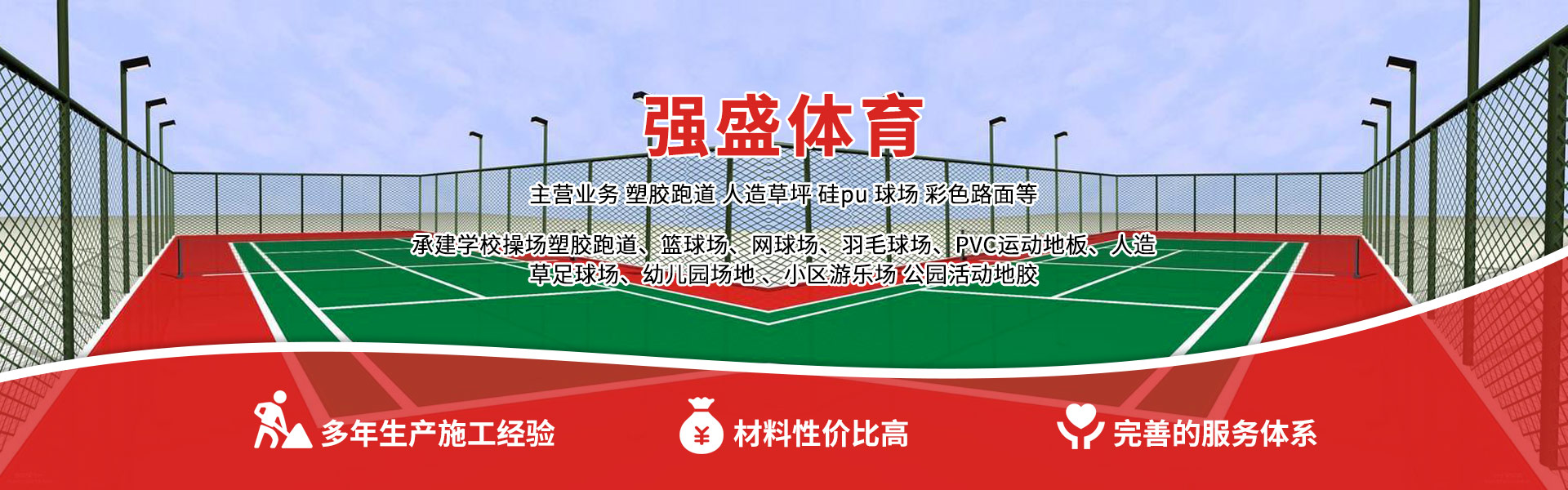 ABOUT US天津强盛体育产业有限公司是一家集研发、生产、销售、施工为一体的专业服务商、承建学校操场塑胶跑道、篮球场、网球场、羽毛球场、PVC运动地板、人造草足球场、幼儿园场地 、小区游乐场 公园活动地胶的公司,具有多年生产施工经验,材料性价比高,信誉良好,质量有保障,拥有完整、科学的质量管理体系,选择我们,就是选择放心。“项目策划咨询、提供设计方案、高品质运动设施供应、专业工程营建和完善的售后服务体系”是公司对每位用户的承诺。公司好的产品、先进的技术、完善的服务体系,奠定了我们在行业内的口碑.。我们的成绩离不开广大客户、合作伙伴的支持与鼓励,我们将一如既往,不懈进取,永远成为您诚挚信赖的伙伴。 天津强盛体育产业有限公司的诚信、实力和产品质量获得业界的认可。欢迎各界朋友莅临参观、指导和业务洽谈。